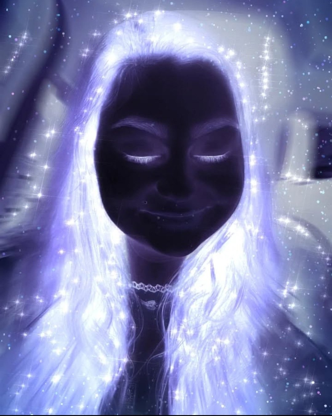 Madame Amethyst autograph signature with a rose flourish and a faded kiss in the color amethyst.